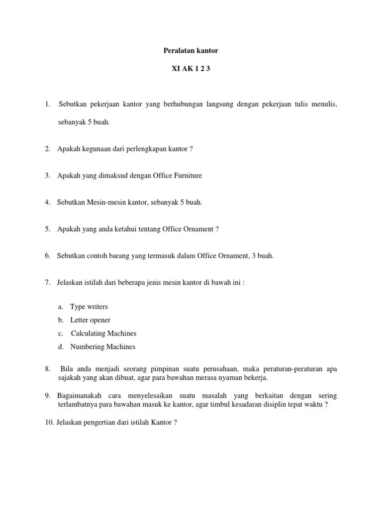 Apakah yang dimaksud dengan perlengkapan kantor? Peralatan kantor · meja dan kursi kantor · perangkat komputer · printer & scanner · mesin fotokopi · alat penghancur kertas · mesin absensi · lemari . Mengelola peralatan kantor hari/tgl : Jawablah pertanyaan di bawah ini dengan benar! Salah satu kegunaan perlengkapan kantor adalah? Contoh soal dan jawaban tentang peralatan dan perlengkapan kantor demikian contoh soal administrasi perkantoran tentang pengertian tata usaha. Contoh soal administrasi perkantoran dan kunci jawaban soal . Yang dimaksud barang habis pakai yaitu. Membuat hancur pekerjaan kantor b. Keadaan dimana seseorang makanan tempat kerja atau peralatan aman sehat dan . Soal dan kunci jawaban sarana dan prasarana pengadaan adm.perkantoran soal pilihan ganda. Contoh soal dan jawaban dokumen kantor administrasi perkantoran 1. Sebagai peralatan kantor yang sekaligus bisa berfungsi sebagai penyimpan dokumen, meja kantor umumnya akan dilengkapi dengan.