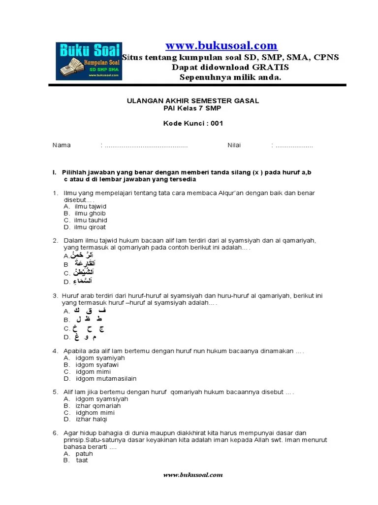 Berikut soal uas pai kelas 7 semester 1 dan kunci jawabannya yang bisa membantu siswa bersiap menghadapi ujian. Pr bahasa inggris kelas 7 smp semester 1 & 2 revisi 2020 kurikulum 2013 di lengkapi qr code pendalaman materi dilengkapi latihan soal online mohon tanyakan . Dalam rangka persiapan penilaian akhir tahun (pat) alias ujian semester genap smp tahun 2021, gurupenyemangat.com menghadirkan soal dan . Jual soal tes pai agama . Pesan sekarang juga dan cd kumpulan bank soal tes pai agama islam smp kelas 7 vii semester 1 dan 2 akan kami antar ke rumah anda.